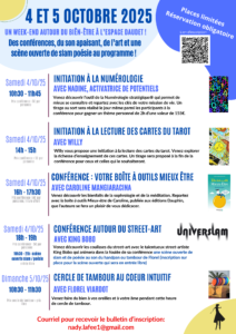 Je vous accueille le samedi 04/10/2025 à 18h pour une conférence sur le street-art, la participation est de 5€, inscription sur https://www.helloasso.com/associations/association-nady-la-fee/evenements/week-end-des-4-et-5-octobre-2025-autour-du-bien-etre?utm_source=app_ha&utm_campaign=share_campaign_button&utm_medium=android